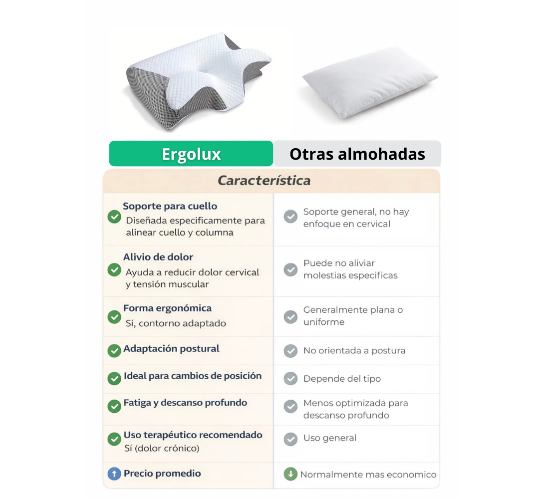 Ergolux está diseñada para ayudarte a descansar mejor cada noche, manteniendo tu cuello y zona cervical correctamente alineados mientras duermes, lo que te permite reducir la tensión acumulada del día. Su diseño ergonómico se adapta a la forma natural de tu cuerpo para que te despiertes con una sensación real de confort y bienestar.